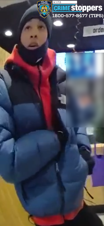 On Saturday, January 3, 2026, at approximately 1900 hours, three unidentified individuals entered a commercial establishment located at 6620 Bay Parkway and approached a 16-year-old male victim. One of the individuals stated to victim, "Give me your jacket," which prompted victim to run out of establishment. The individuals then attempted to remove jacket when the victim fell to the ground. One of the individuals displayed a knife, while the other two individuals continued to strike victim in the face. The three individuals fled westbound on 67 Street to parts unknown.